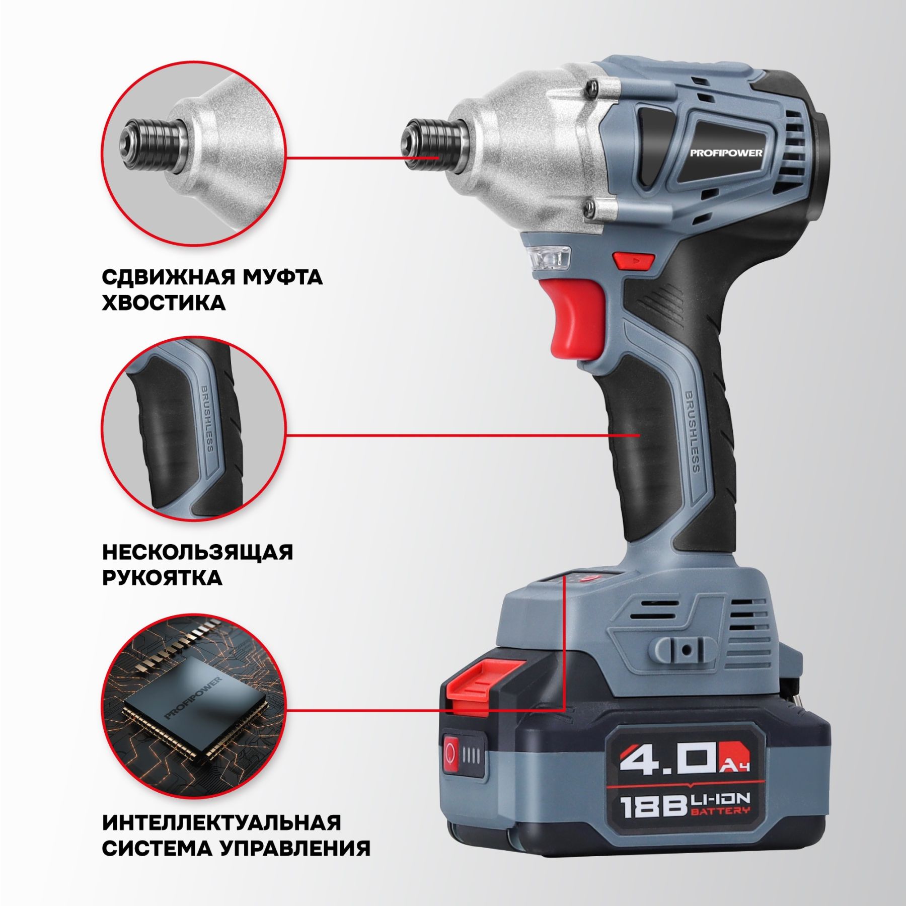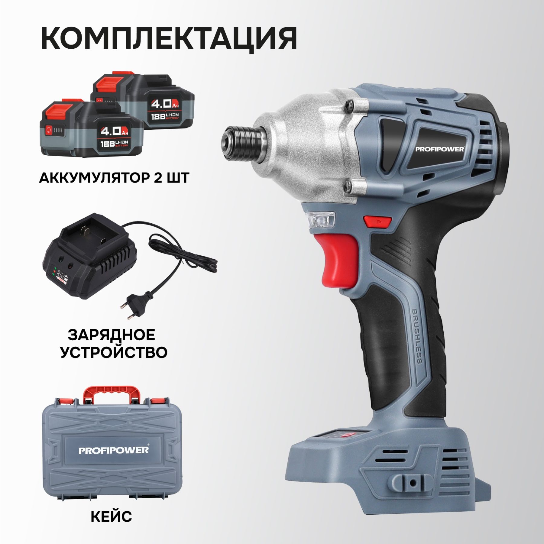 Аккумуляторный винтоверт беcщеточный импульсный ProfiPower MKDTD-18V E0082 (Li-ion-2шт, 4.0Ач, З/У speed, кейс)